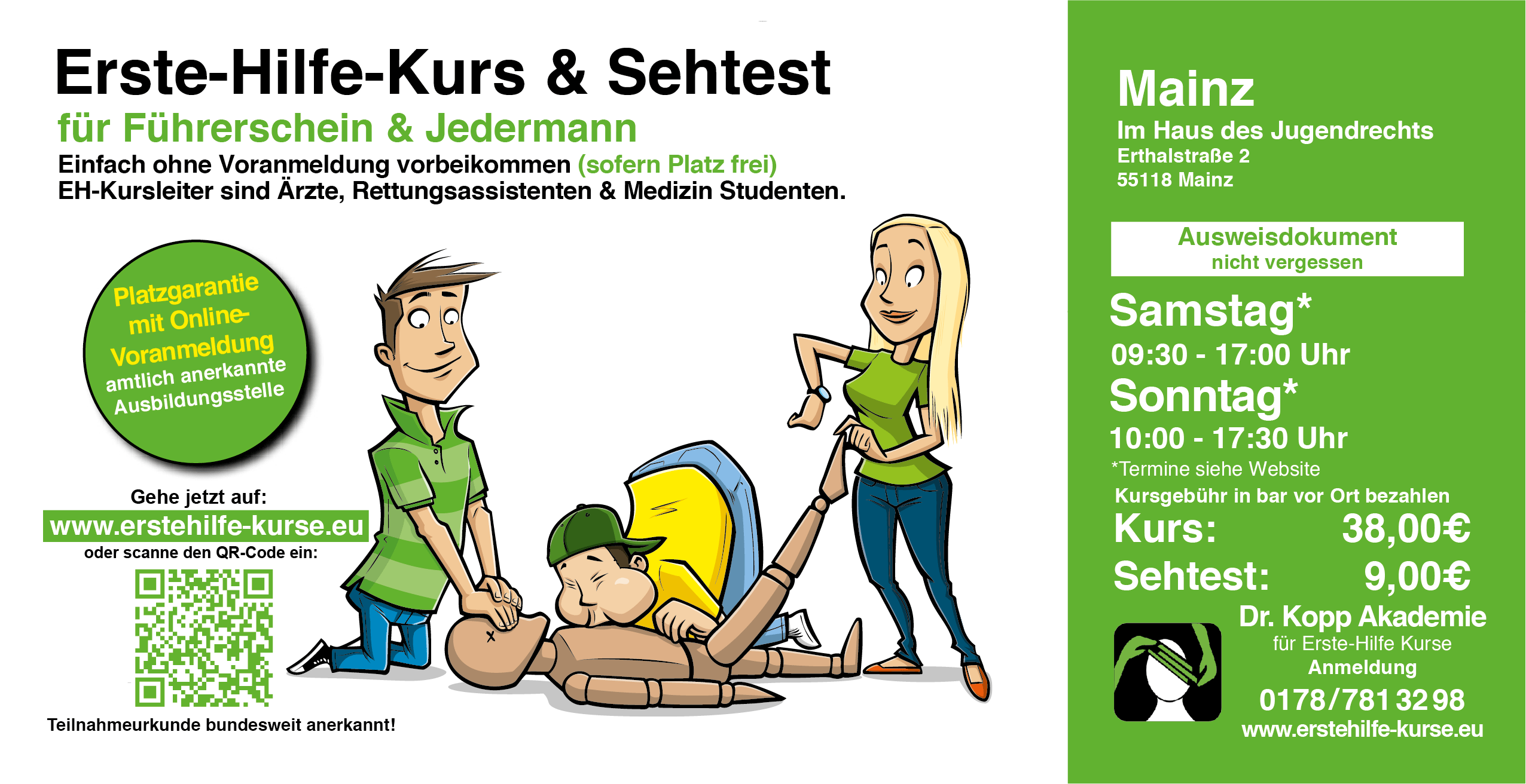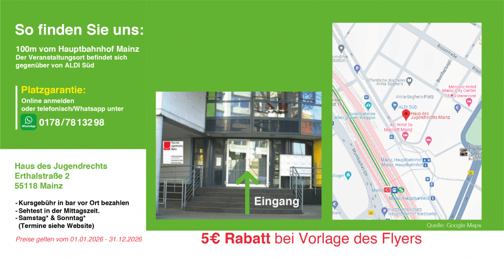 Bei der Buchung eines Erste Hilfe Kurses inkl. Sehtest (+9€ inkl. 19% MwSt.) musst du keine Vorauszahlung leisten. Die Kursgebühr von 36€ wird dann vor Ort bar bezahlt. Der Sehtest ist freiwillig und keine Pflicht (Optional). Selbstverständlich kannst du auch ohne Voranmeldung, sofern noch freie Plätze vorhanden sind, am Erste Hilfe Kurs teilnehmen. Bitte die Termine beachten! Einfach pünktlich vorbeikommen, gute Laune mitbringen und mitmachen!