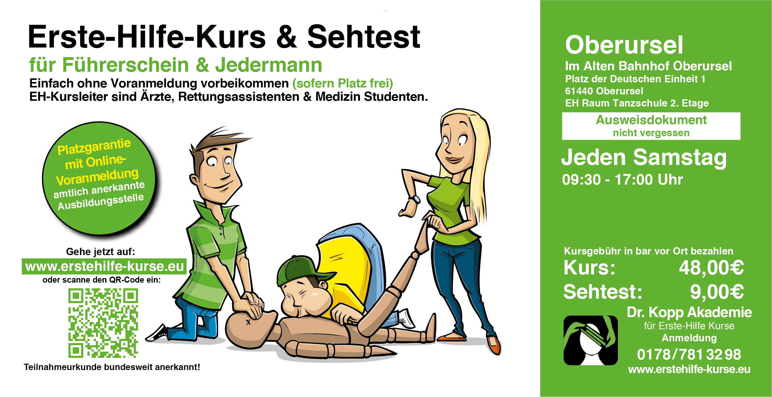 Bei der Buchung eines Erste Hilfe Kurses inkl. Sehtest (+9€ inkl. 19% MwSt.) musst du keine Vorauszahlung leisten. Die Kursgebühr von 46€ wird dann vor Ort bar bezahlt. Der Sehtest ist freiwillig und keine Pflicht (Optional). Selbstverständlich kannst du auch ohne Voranmeldung, sofern noch freie Plätze vorhanden sind, am Erste Hilfe Kurs teilnehmen. Bitte die Termine beachten! Einfach pünktlich vorbeikommen, gute Laune mitbringen und mitmachen!