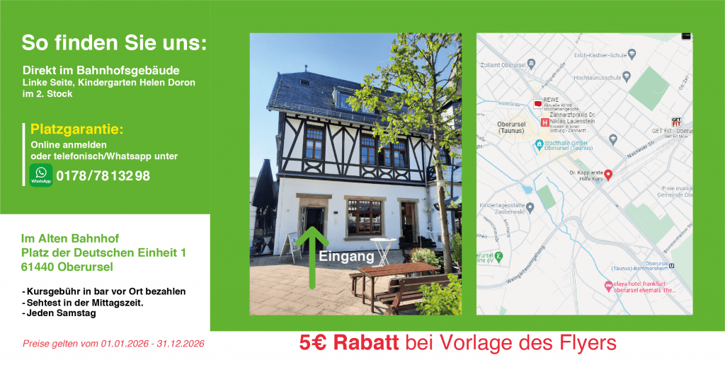 Der Kursort liegt direkt an der S-Bahn-Haltestelle Oberursel im alten Bahnhof Oberursel. Der Eingang ist auf der linken Seite bei dem Kindergarten Helen Doron.